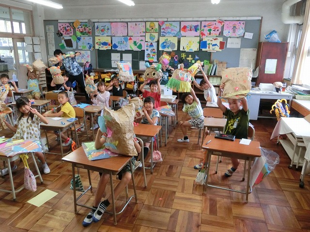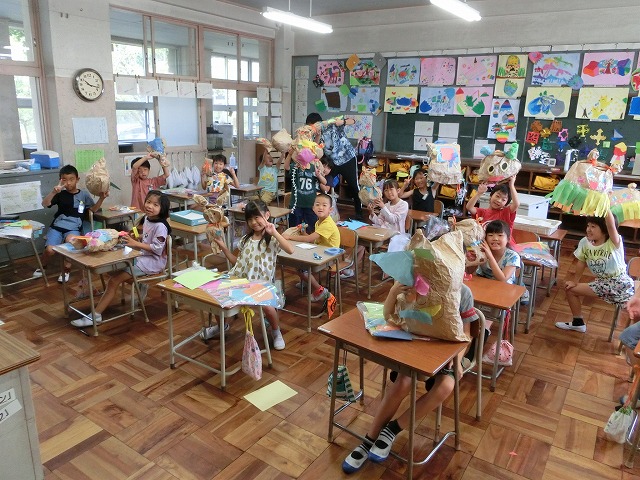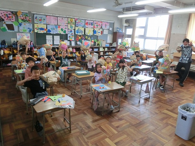 9月14日(木)2年生は図工で、大きな袋を使って作る「くしゃくしゃぎゅ」の製作に取り組んでいます。まだ完成していない子もいますが「今の所」でのハイチーズでした。みんながんばって作っています。