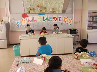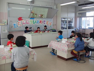 1月16日(火)お誕生日給食を行いました。この日は12月、1月生まれの児童が家庭科室に集い、給食委員会の司会のもとクイズ大会などをしながら、楽しい時間を過ごしました。また、お誕生日給食時にだけもらえる特製のデザートもいっしょにいただきました。次のお誕生日給食は2月、3月生まれの児童を対象にして、2月に行う予定です。