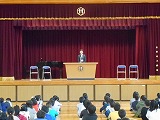 児童会代表が本校の特色ある学校行事等を紹介するとともに、「いろいろ聞いてください。」と呼びかけました。