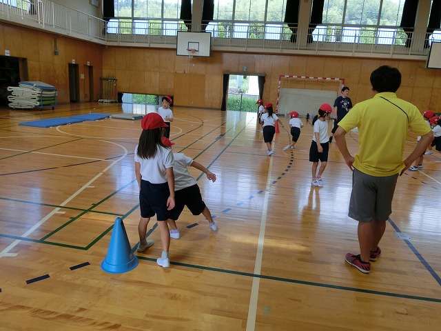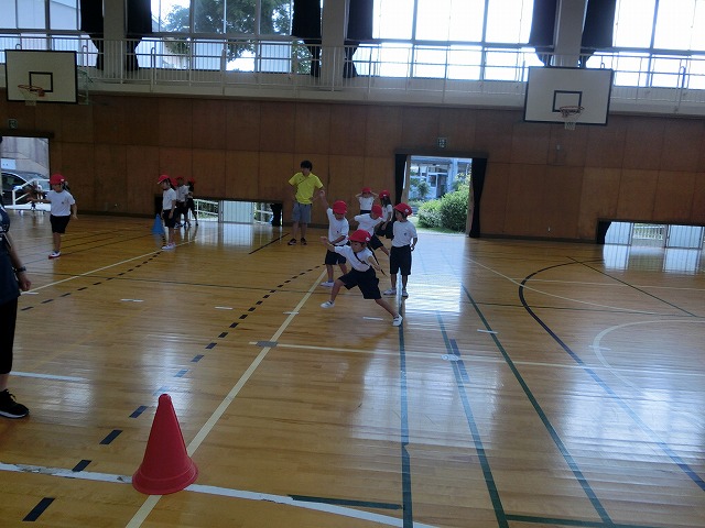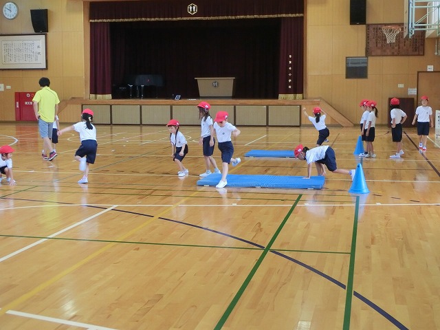 9月4日(月)体育館では1年生が「とぶうんどう」で、川に見立てた空間に落ちないようにジャンプして跳び越える練習をしました。今日も適度に休憩時間を取りながら、元気に活動していました。
