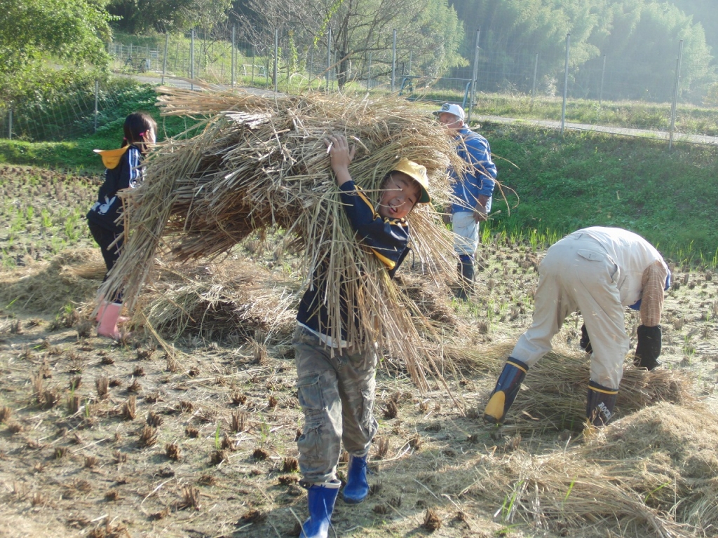籾をとった後の藁も束ねて、せっせと運びます。