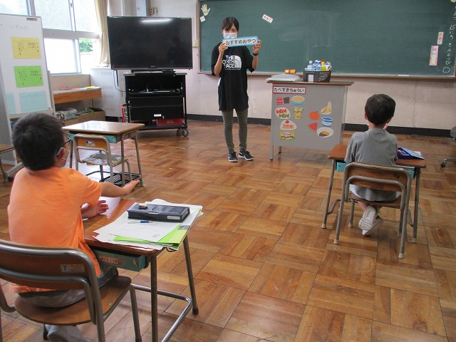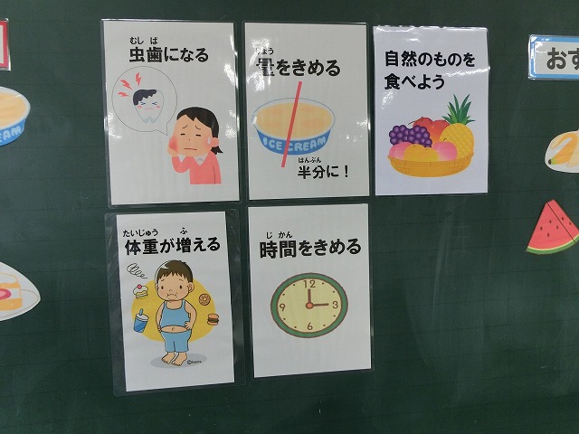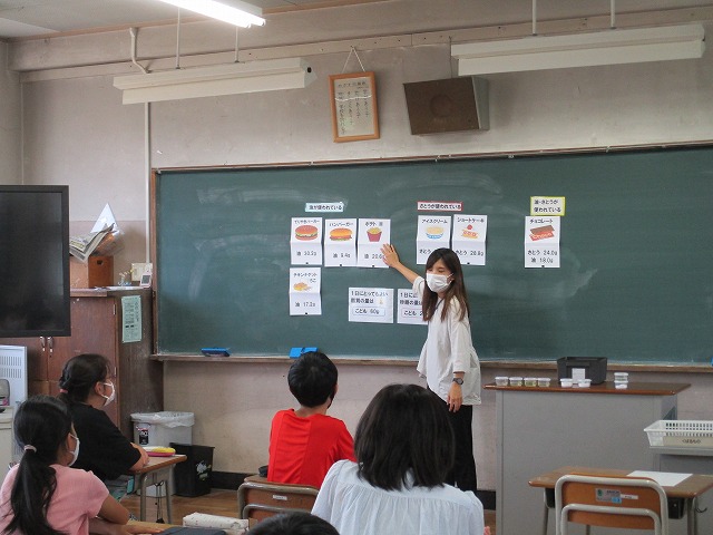 全学年で栄養教諭の平塚先生からおやつの食べ方について話を聞きました。みんなが大好きなおやつに使われている油や砂糖の量を実際に見ながら、食べ過ぎると健康によくないことを教えていただきました。「食べる時間を決める」や「食べる量を決める」など上手に食べて、健康な体を作りましょう。