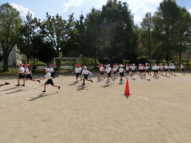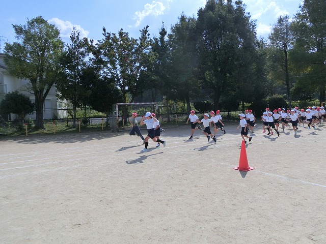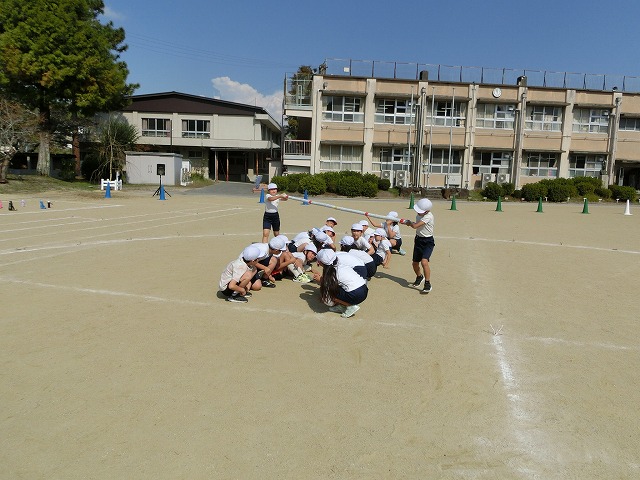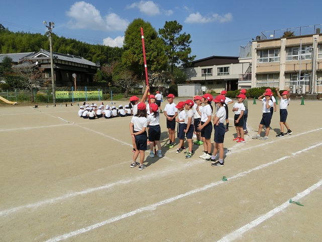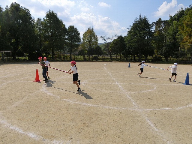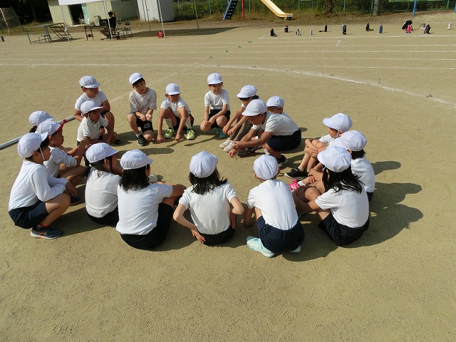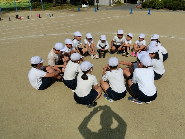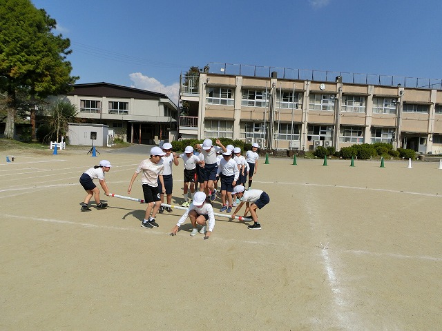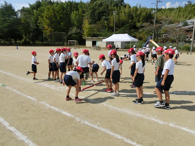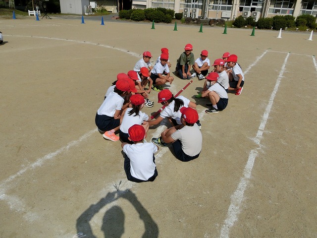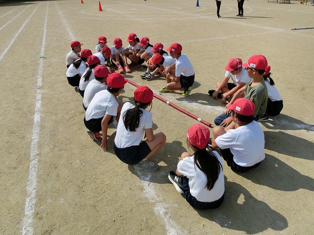 10月23日(月)3・4年生は団体競技「竹、持って走るやつ♪」の練習をしました。赤白それぞれのグループで集まり、竹の持ち方や跳び越え方、竹の立て方などについて作戦会議を行いました。