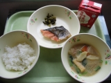 日本で最初に学校給食として出された「鮭の塩焼き」と、大正12年ごろに出されていた「すいとんのみそ汁」を組み合わせた献立です。