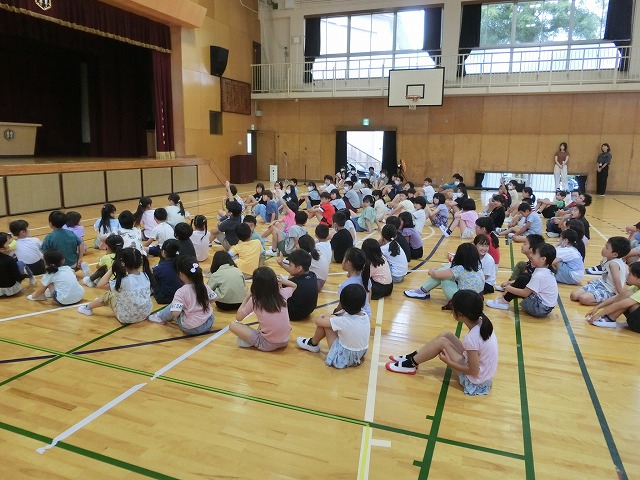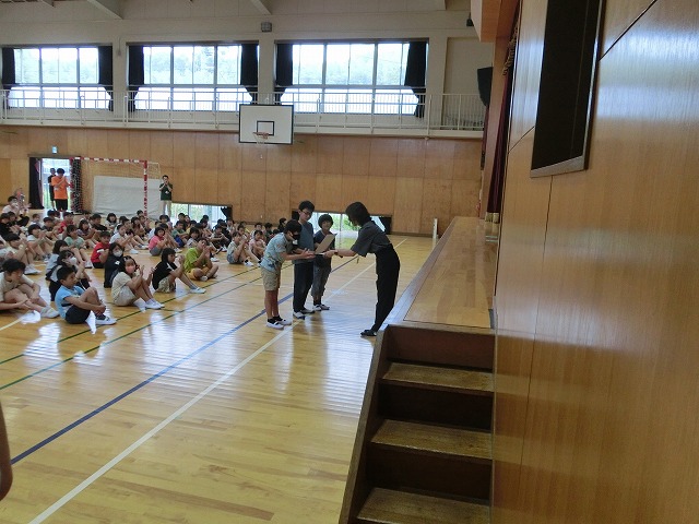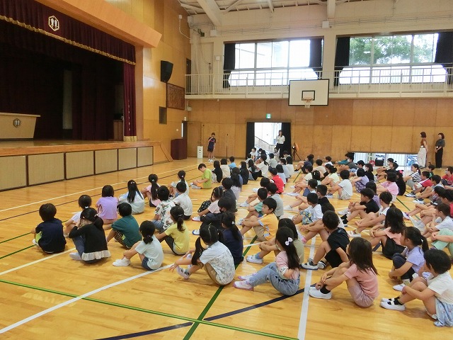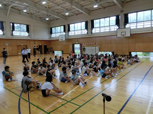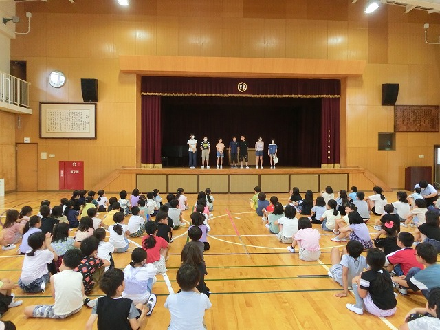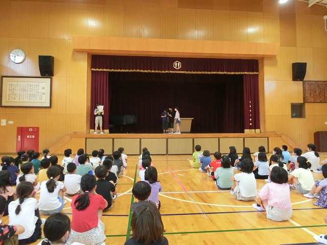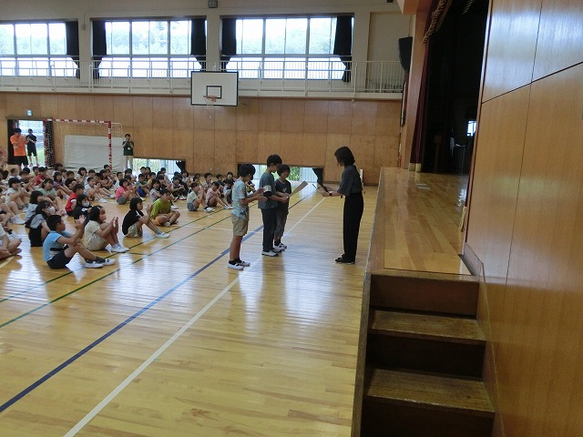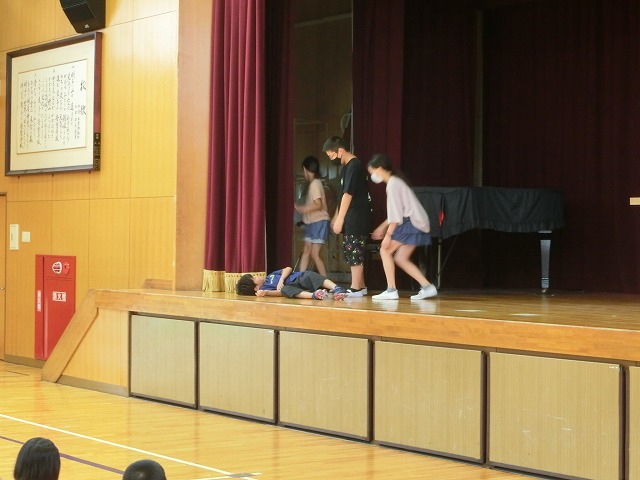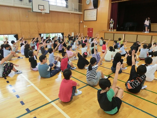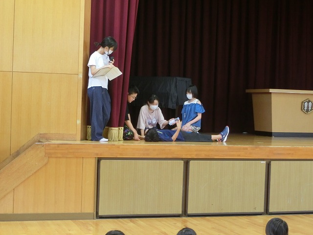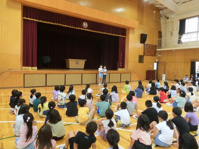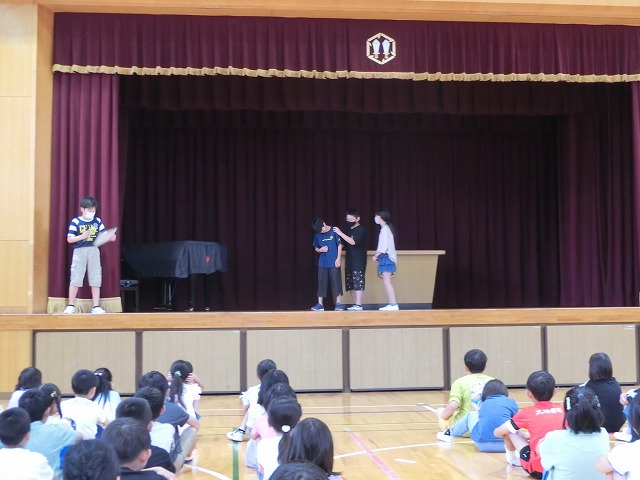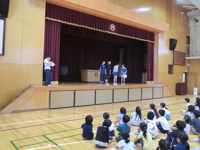 7月5日(水)今日の朝学習の時間に全校で体育館に集まり、児童朝礼を行いました。今日は保健委員会が熱中症について発表しました。「もしも熱中症になったらどうしたらいいか」ということで、熱中症になってしまった時にどのような行動を取ったらいいか劇とクイズで全校に分かりやすく説明してくれました。