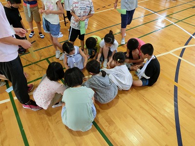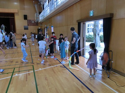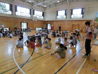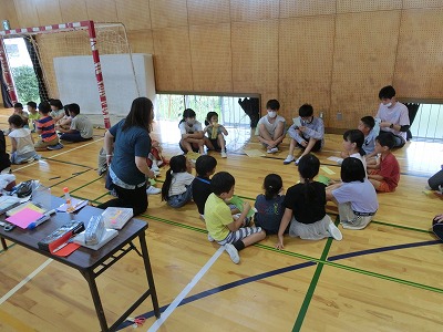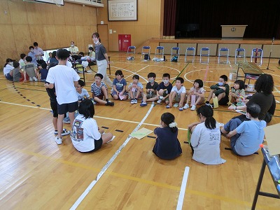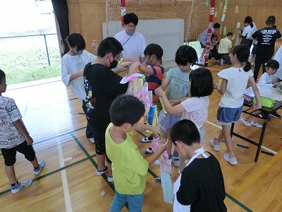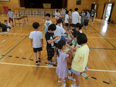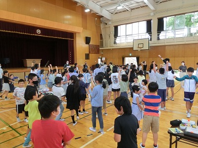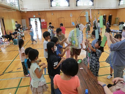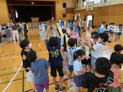 今年は数年ぶりに全員が体育館に集まり、みんなで行いました。校長先生のあいさつ、児童会運営委員のあいさつの後、みどりの風作業さんとは「じゃんけん大会」、ふくろう工房さんとは「〇×クイズ」で大変盛り上がりました。その後、なのはなグループで輪になり自分の願い事を発表し、七夕飾り付けを行いました。みんなで過ごす楽しい時間となりました。