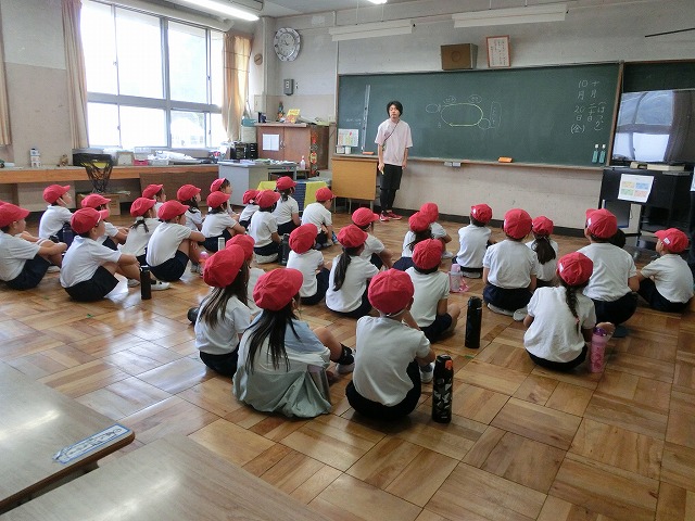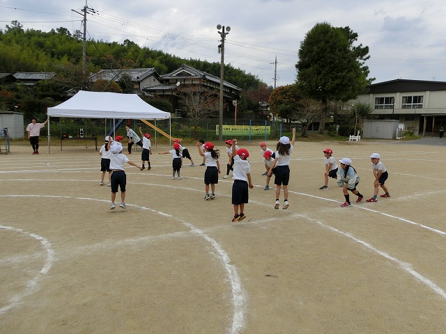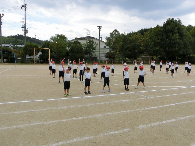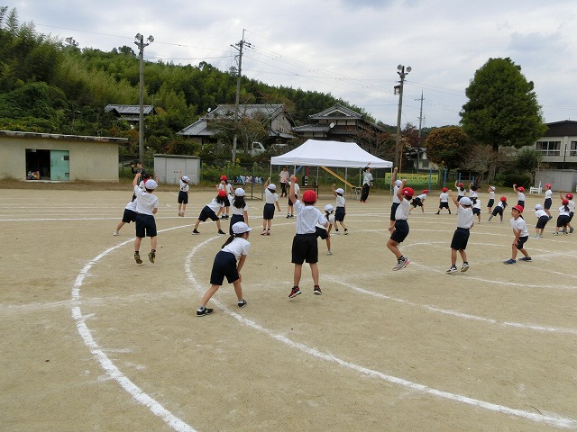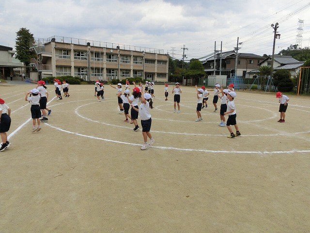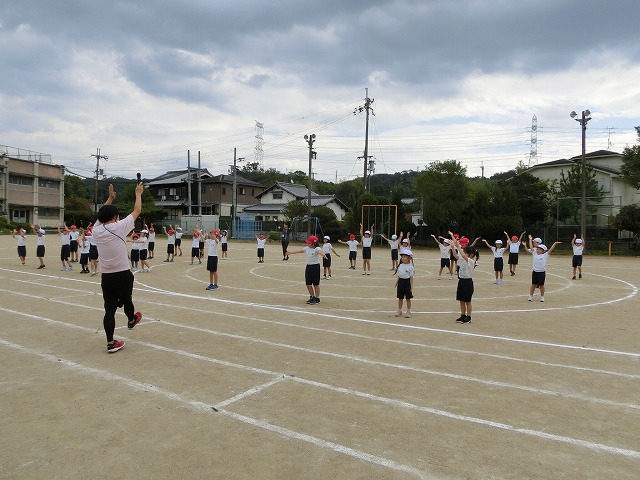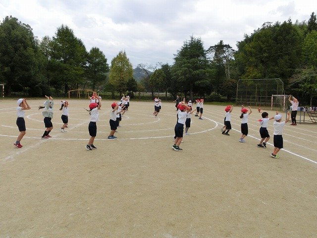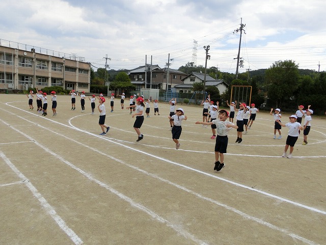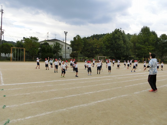 10月20日(金)今日は運動場での入場の仕方、団体競技についてのお話の後、初めて運動場で踊ってみました。1・2年生の子どもたちは、今日も可愛く何度も「ジャンプ」して一生懸命、体を動かしました。