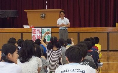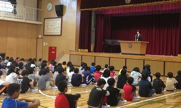5月29日(水)全校朝礼を行い、教頭先生が「賢寺小学校のよい伝統」について話をされました。
