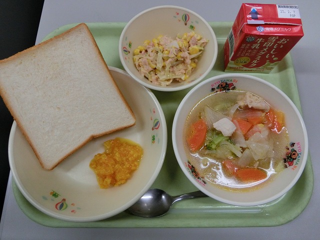 1月27日(金)給食週間特別献立の最終日でした。今日は『エコクッキング2』ということで、食パン、まるごとみかんジャム、皮ごと冬野菜のスープ煮、ツナとコーンのサラダという献立で、名前の通り野菜や果物の皮もまるごと使用したものでした。