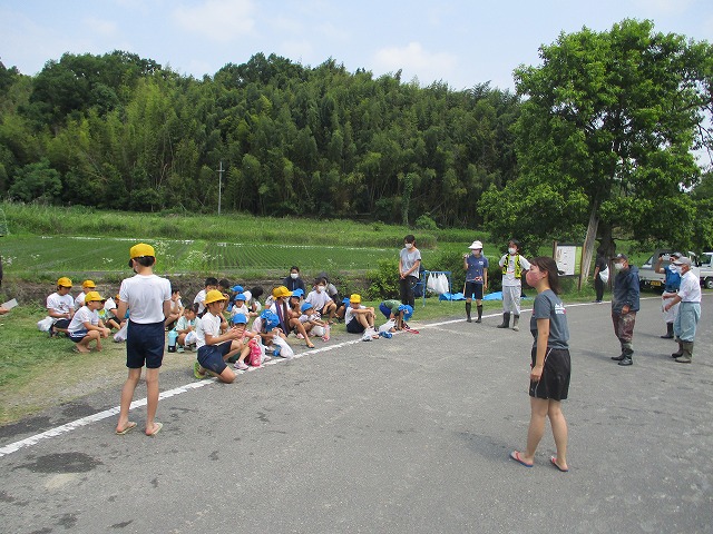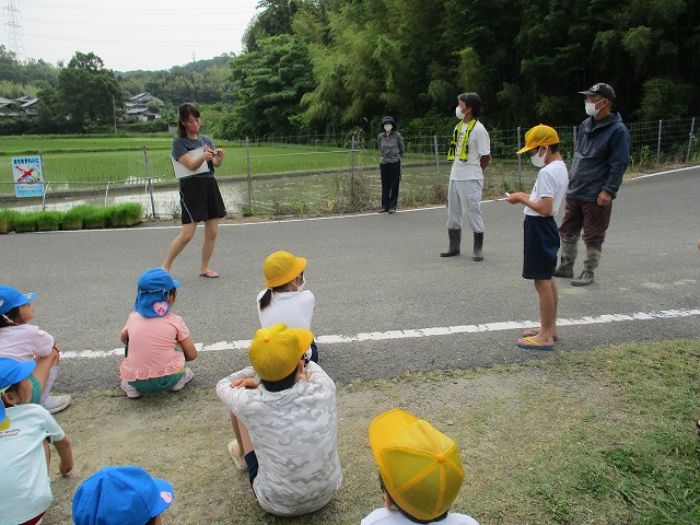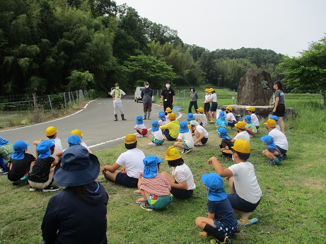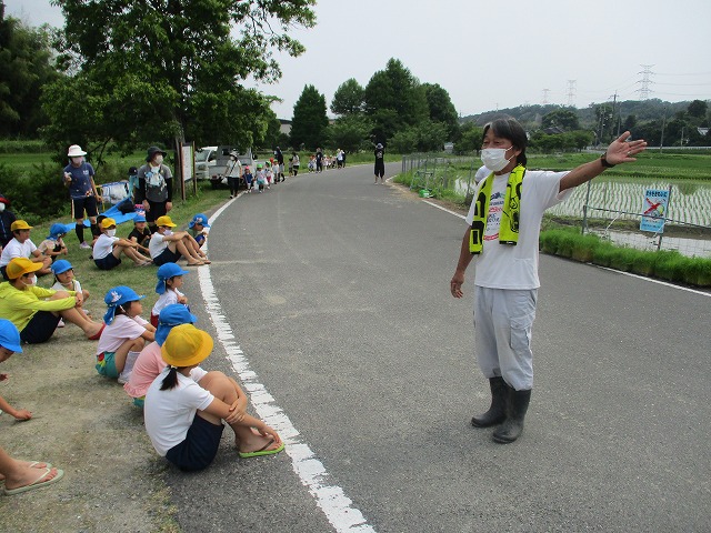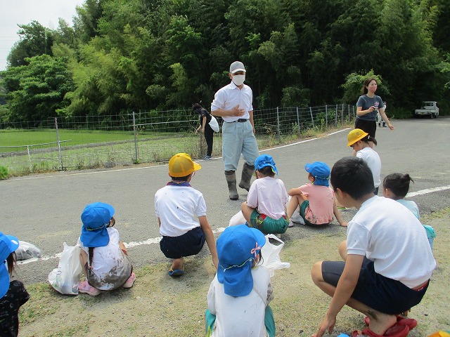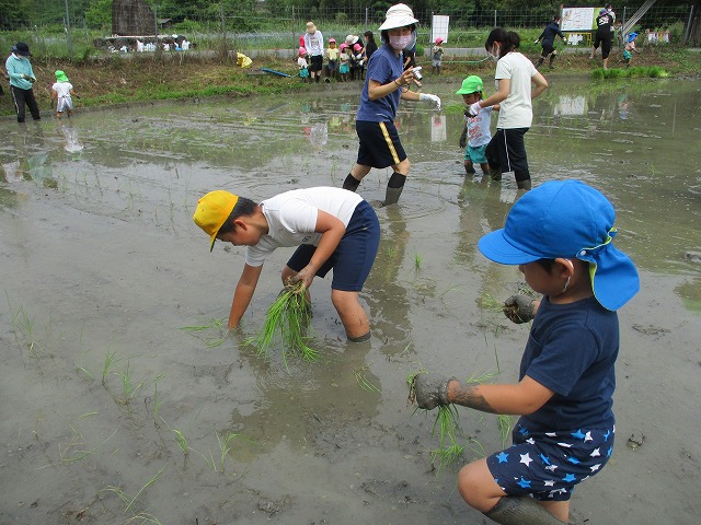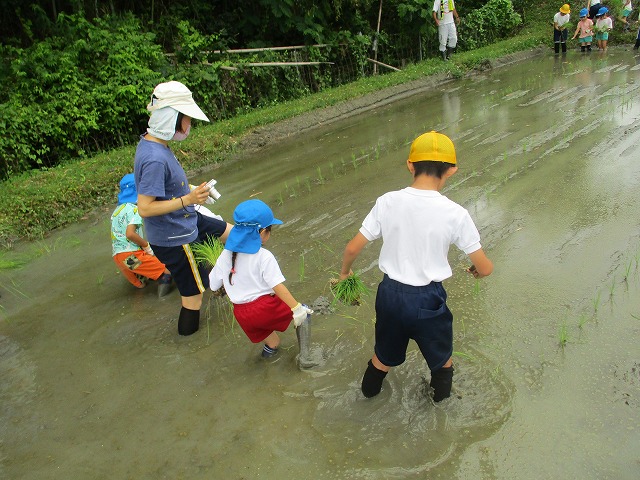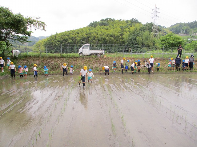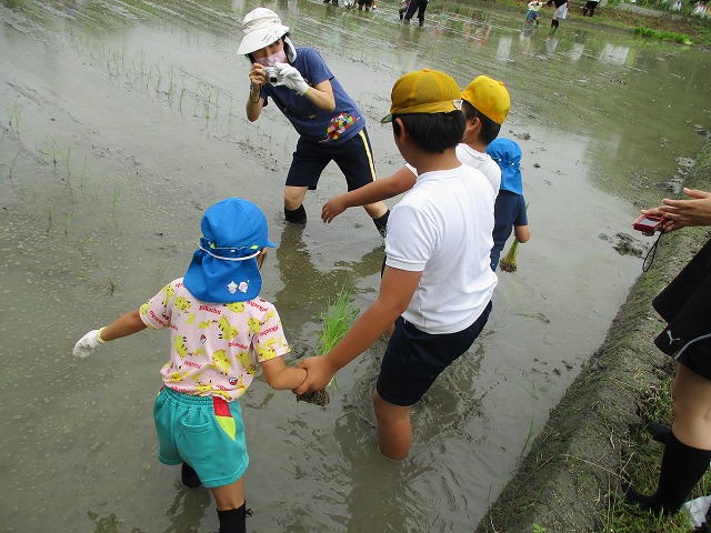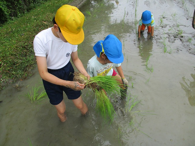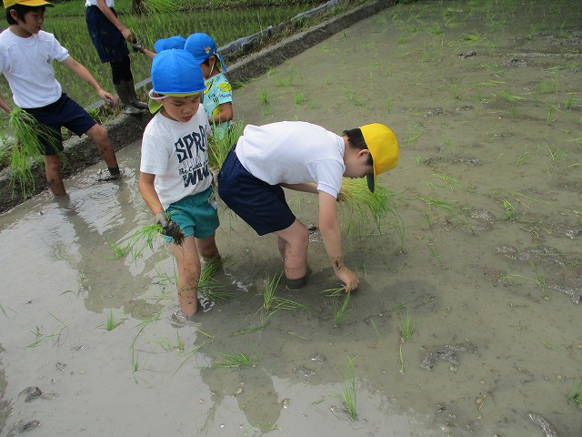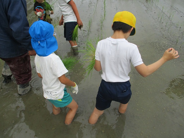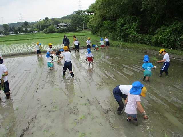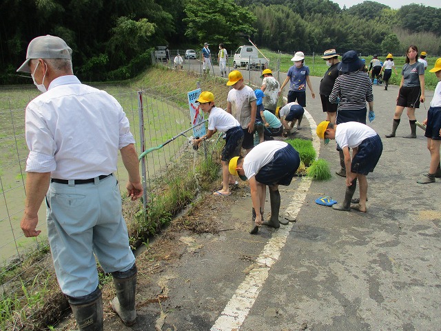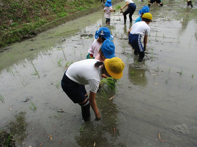 5年生が田んぼの学校で田植えをしました。5月にもみまきをした種が大きな苗に成長しました。今日はその苗を田んぼに植えました。普賢寺幼稚園の年長のみなさんと一緒に苗を片手に田んぼに入りました。泥に足をとられたり、植えた苗が浮いてきたり、悪戦苦闘しながらも、だんだんと上手になり、田んぼ一面に苗を植えました。次はドローンを使った稲のお世話の見学です。成長していく稲を見るのが楽しみですね。田植えの準備や足を洗う水道の設置など、たくさんお世話になった、堀江さん、大冨さん、大西さん、正田さん、中