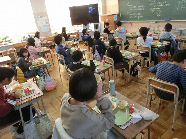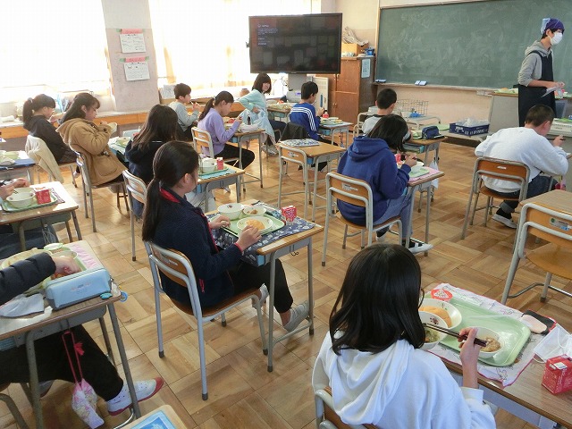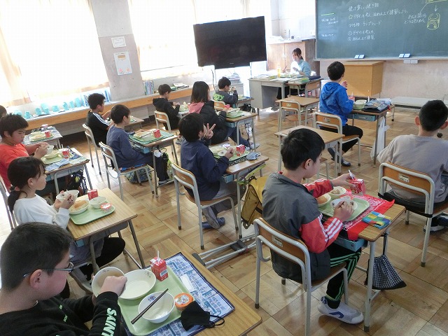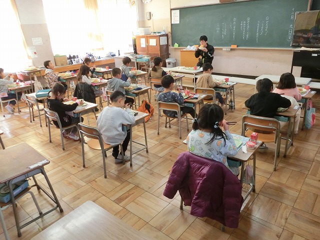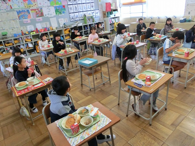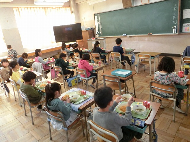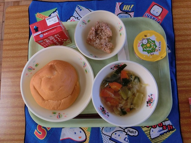 12月9日(金)今日の給食は、みんなの大好きな、うずまきバターパン・フライドチキン・お楽しみデザートがメニューの「お楽しみ献立」でした。11月のお誕生日の人の名前の放送もありました。今日もおいしくいただきました。