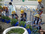 5月にまいたあさがおの種が、双葉・本葉を出し、つるを伸ばしています。