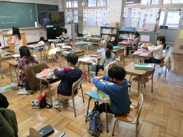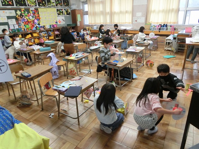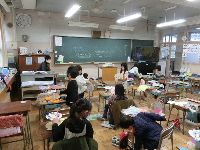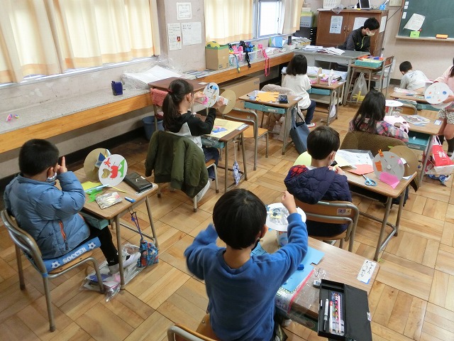 2月24日(金)1年生は図工科で、紙皿を使ってコロコロ回りながら移動する作品の作成に取り組んでいます。ある程度完成した子は、回してみたり、実際に動かしてみたりしながら、楽しく学習しています。