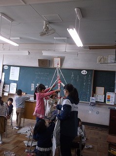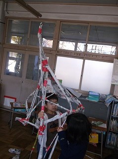 11月28日(火)1年生が図画工作の時間で新聞紙を使って、タワーづくりをしました。1年生の児童は新聞を丸めて棒状のものをたくさん作り、その棒を組み合わせてグループでタワーを作りました。棒の組み合わせ方や配置に工夫しながら、グループで協力してタワーを完成させました。クラスには様々な種類のタワーがそびえることとなりました。
