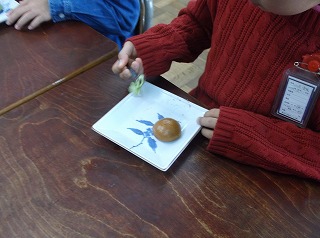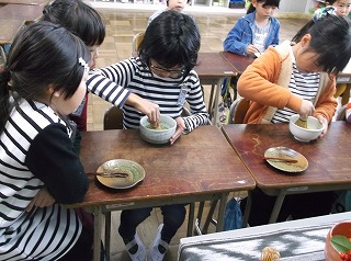 12月1日(金)3年生が総合的な学習の時間を使って、抹茶体験をしました。この取組は3年生がお茶についての学習をしている取組の一環で、和菓子と一緒に抹茶をたてていただきました。子どもたちは、茶せんで抹茶を立てながら上手にお茶をいただいていました。地域の伝統的な産業であるお茶に対する関心が深まった取組でした。