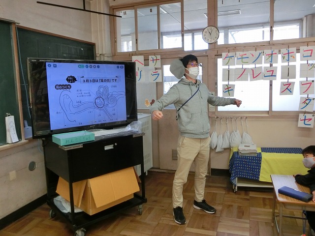 3月3日(金)体重測定にあわせて、今日は1・4年生で保健指導を行いました。動物の耳の働きや、人間でも耳には『話や音を聞く』だけでなく、体全体のバランスをとる等の働きがあることを改めて知ることができました。