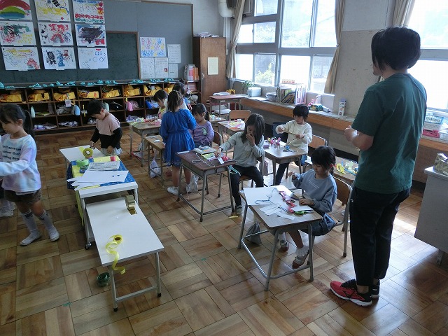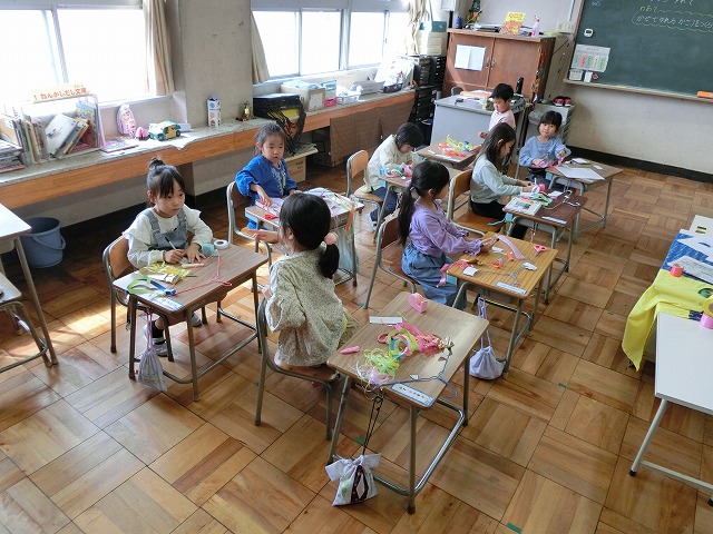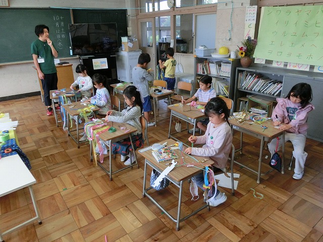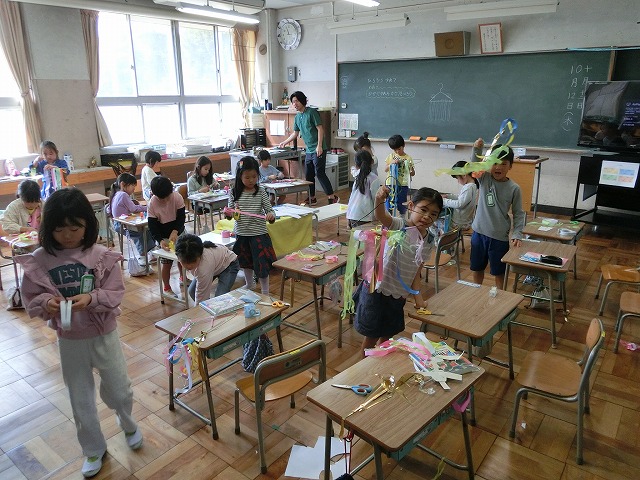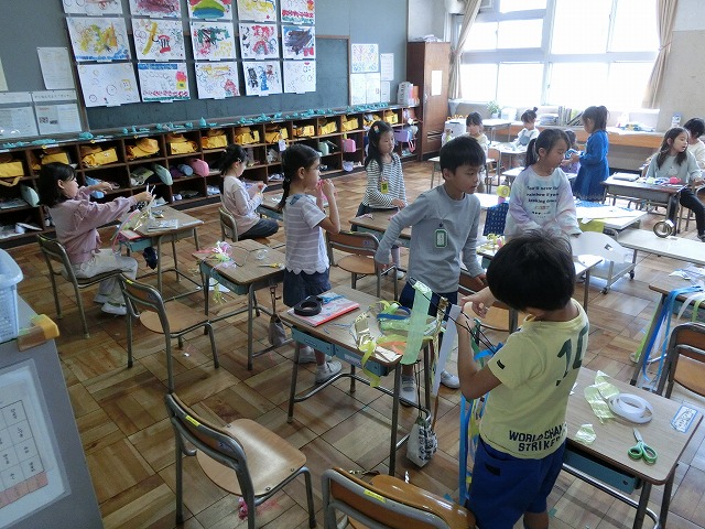 10月12日(木)1年生は図工「ひらひら ゆれて」に取り組みました。色紙やリボン、ハンガーを使って風で揺れる可愛らしい飾りを作りました。