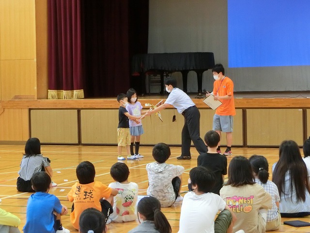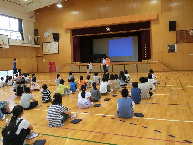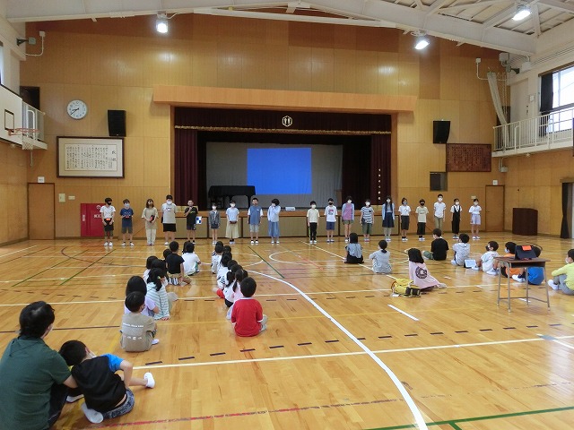 児童朝礼を行いました。今回は始めにプール開きを行いました。校長先生から『安全の鍵』を代表して1年生が受け取り、いよいよ今週から3年ぶりのプール学習が始まります。みんなで楽しく安全に、水泳学習をしましょう。