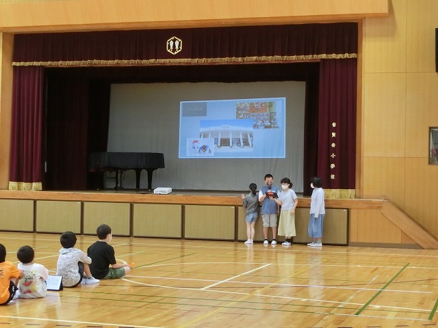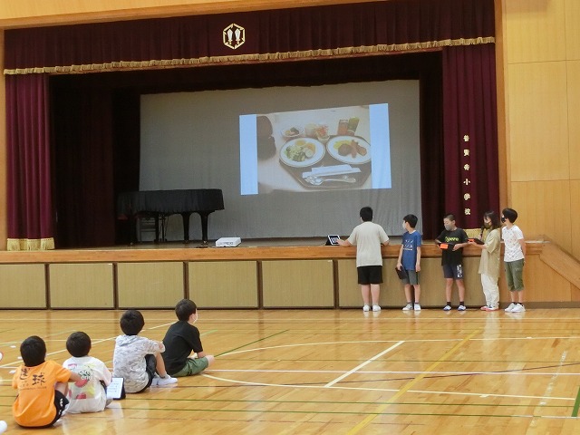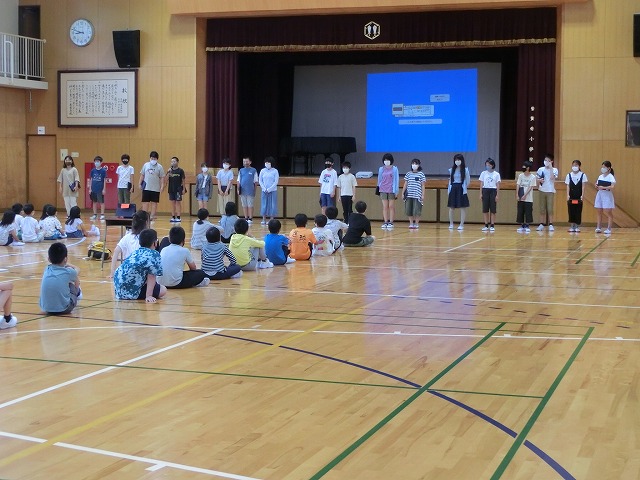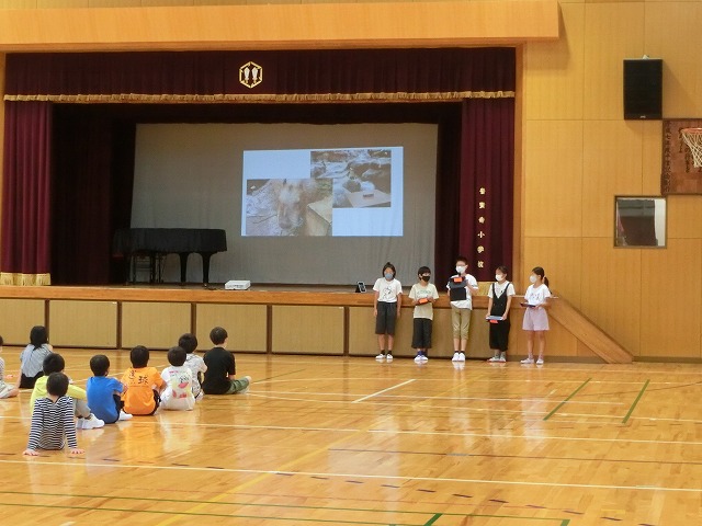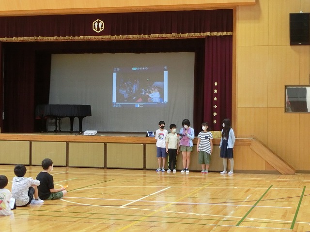 その後、6年生から5月31日・6月1日に伊勢志摩方面に行ってきた修学旅行報告の発表がありました。見てきたもの、体験したことを写真や動画を交えながら、全校の前で堂々と発表しました。楽しかった修学旅行の様子が伝わってきました。