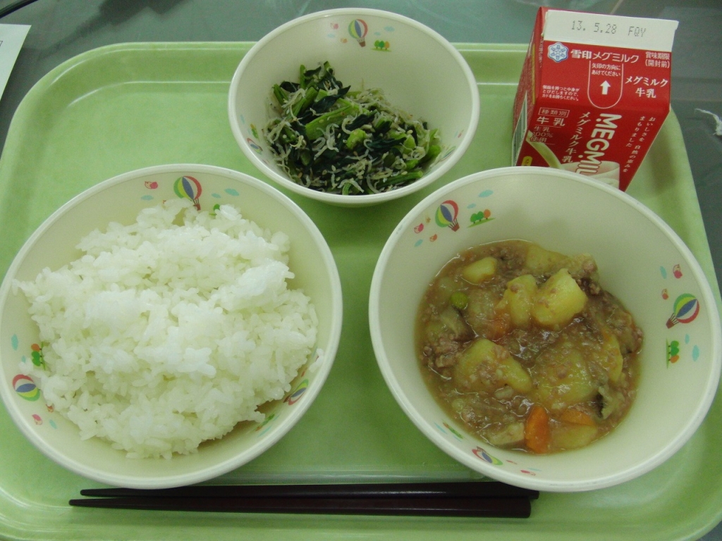 牛乳、ごはん、じゃがいもあんかけ、小松菜とじゃこの炒め煮