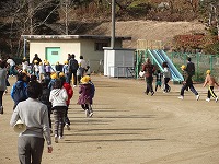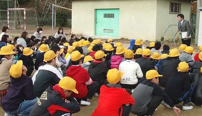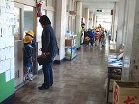 先生の指示や校内放送にしたがって、園児と児童が普賢寺小学校のグランドに集まりました。