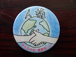 これは、人権学習を通して、子どもたちから人権に関わる「言葉」「マーク」「絵」などのデザインを募集したところ、多くの応募作品があり、その中から6年生が考案した作品を人権(缶)バッチとして作成したものです。