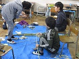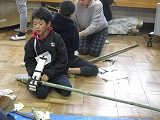 12月19日(木)4年生は同志社大学えこまな(学生の環境について考え取り組む団体)の皆さんと一緒に、竹を使った遊び道具を作りました。