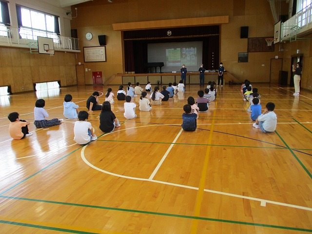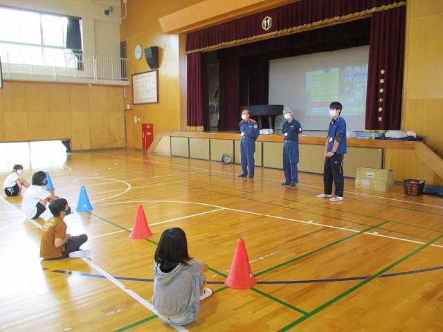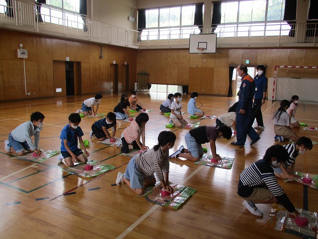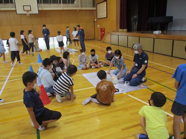 5、6年生が5、6時間目に消防署から講師を招き、救急救命講習を行いました。通報してから救急車が到達するまでにかかる時間、平均10分。この10分間に命を救うためにできることを学習しました。胸骨圧迫とAEDの説明を聞き実技をしました。