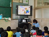 今回、中学年は大型テレビを使っての読み聞かせです。