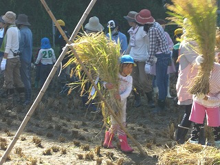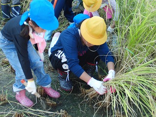 5年生と5歳児がペアを組んで稲を刈り、刈った稲は保護者の方が束ねてくださいました。