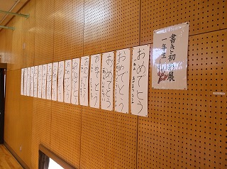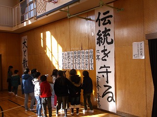 1月11、12日と2日間にわたって、書き初め展を行いました。子どもたちは各々が10日(火)の書き初め会で書いた作品に加えて、学年で画仙紙に大きく書いた作品も合わせて展示を行いました。また、書き初め会で社会人講師の辻尾仁郎さんに書いていただいた今年の干支にちなんだ「犬と散歩」の作品も展示しました。本校の子どもは、もとより保護者・地域の皆さんに見ていただきまして、ありがとうございました。