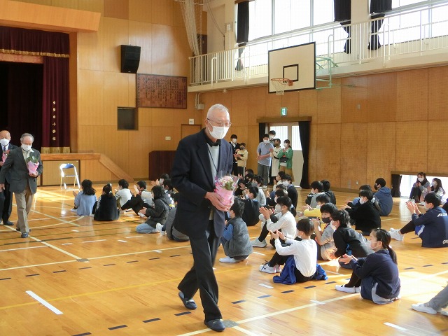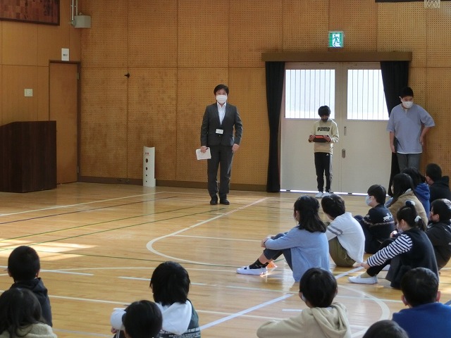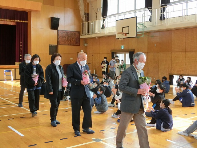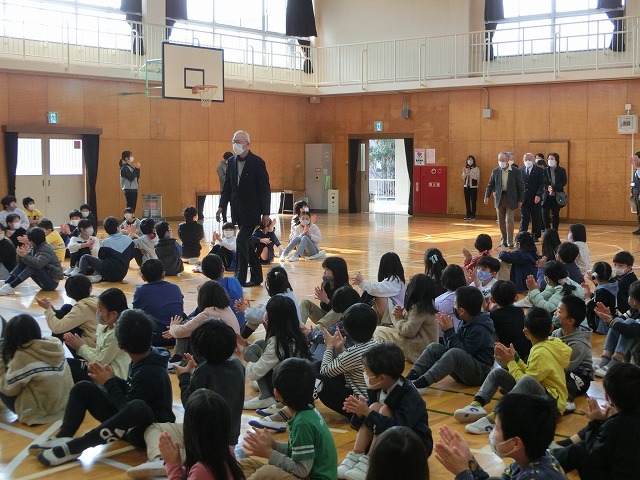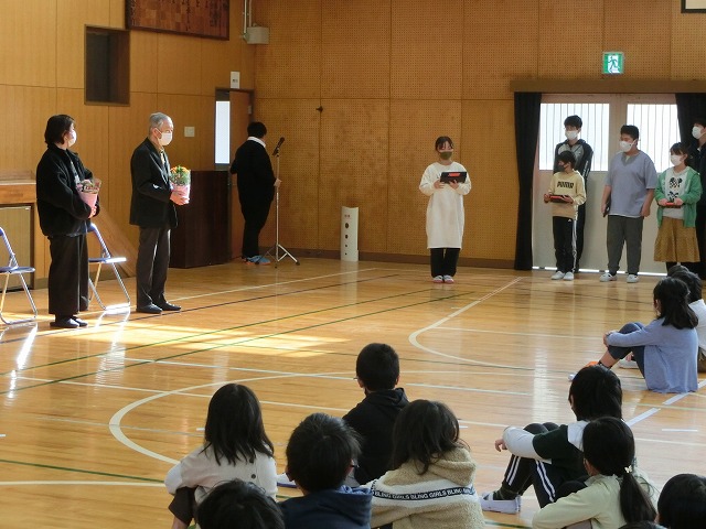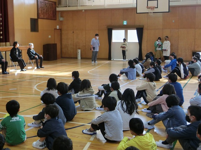 3月8日(水)今日の朝学習の時間に全校児童で体育館に集まり、日頃お世話になっている、地域安全ボランティア、図書ボランティアの代表の方、スクールバス運転手、社会人講師の方々に来校いただき、感謝の集いを行いました。