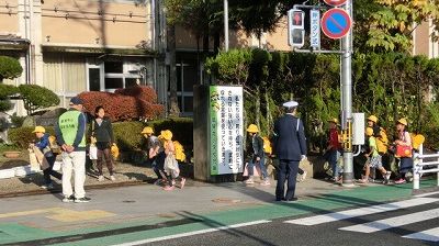 11月10日(月)の登校の様子です。この日は田辺警察署の方に来ていただき、安全指導をしていただきました。