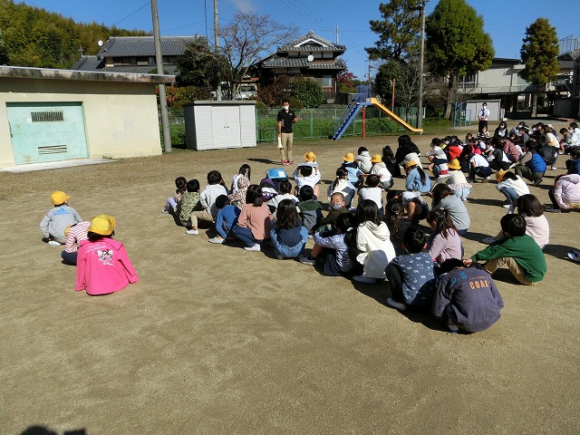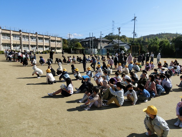 11月2日(水)京田辺市のシェイクアウト訓練にあわせて地震の避難訓練を行いました。地震が起きたときに命を守るためにはどうしたらいいのかを学習しました。地震が起こったら頭を守り、「おはしもて」の約束に気をつけて避難しましょう。普賢寺幼稚園のみんなも一緒に避難訓練を行い、小学校の運動場に避難してきてくれました。