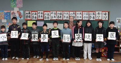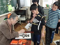 2月27日(木)、6年生は辻尾仁郎先生(地元書道家)から習字の特別授業を受けました。