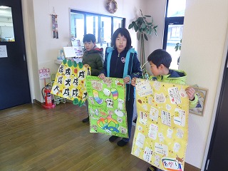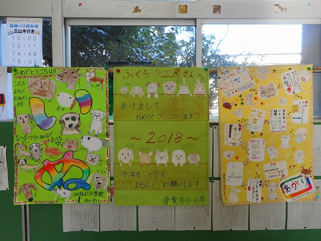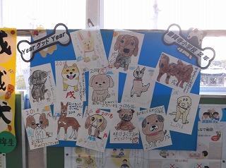 1月12日(金)子どもたちが作成したジャンボ年賀状を福祉教育で交流を行っている共働SPACEふくろう工房と緑の風作業所に届けました。今年の干支にちなんだ犬をあしらって、工夫を凝らした各学年の年賀状をそれぞれの施設の方に喜んで受け取っていただきました。今年もよろしくお願いいたします。