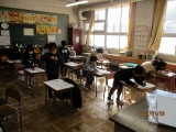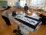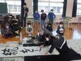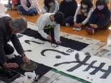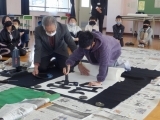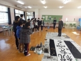 例年は体育館に全校児童が集まって行うのですが、今年度はコロナウイルス感染予防のため、講師の書家 辻尾先生がコンピュータルームで書いてくださる書き初めを、各教室のモニターで見学しました。そのあと各学年が順番に講師の先生のもとに集まり、学級全員で書き上げる作品に取り組みました。また教室では一人一人が自分の作品に取り組みました。