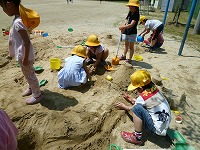 砂場では山をつくったり、水を運んできて川をつくったりして、楽しく活動しました。何人かで協力しながら迷路をつくる人もいました。