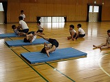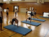 伸膝後転、側方倒立回転など、マットの技に取り組みます。