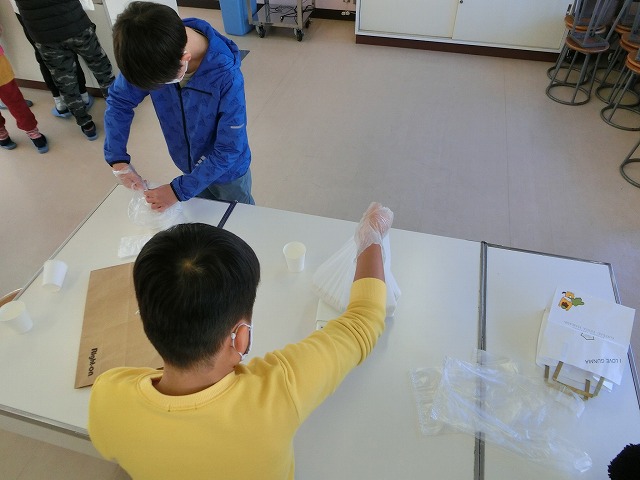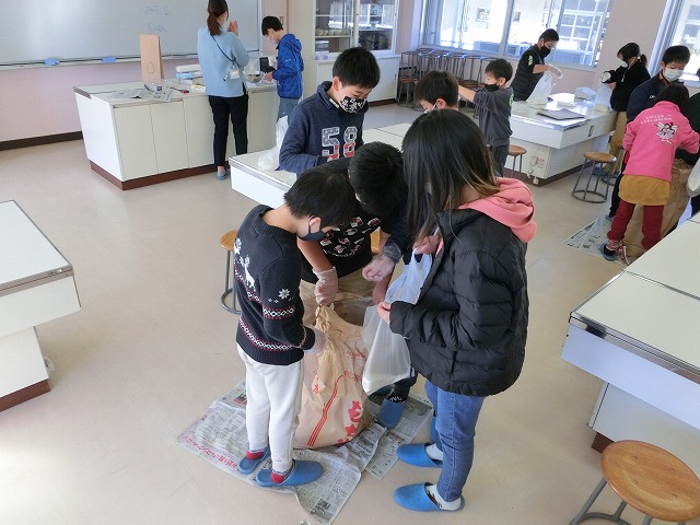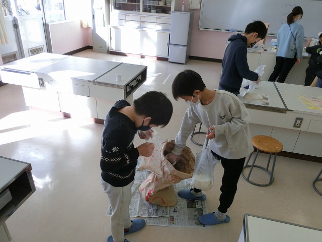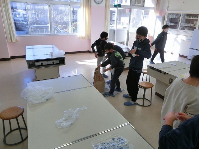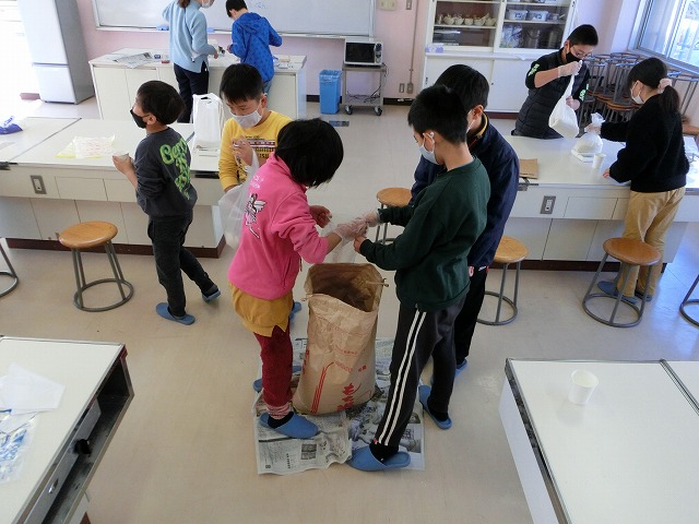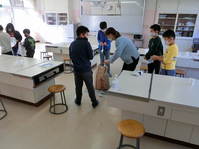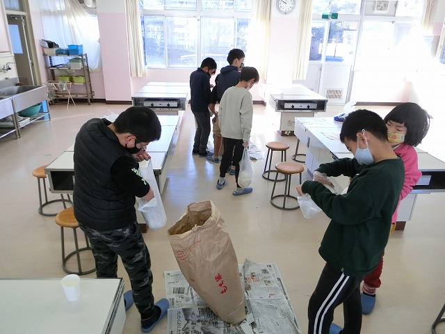 12月19日(月)5年生が自分たちで作ったもち米の仕分け作業を行いました。これは以前普賢寺ふれあいの駅で販売したお米で、この春から、種まき・苗代づくり・田植え・稲刈り・精米など、田んぼの学校の堀江さんを中心にお世話になり作ったものです。子どもたちは自分の分、1人1kgを量り、今日それぞれ持ち帰ります。どんな料理でいただくのでしょう?楽しみですね。