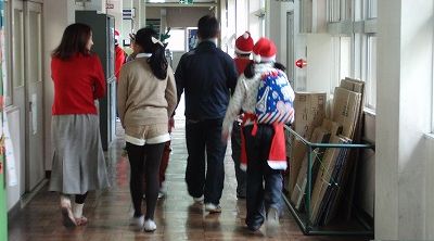 今日は気温が低く冷たい一日でしたが、教室の中は一足早いクリスマスプレゼントに温かい時間が流れました。役目を終え、さっそうと歩く児童会運営委員の6人と児童会担当の先生。さて次はどこの教室に現われるのかな?