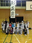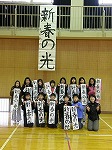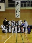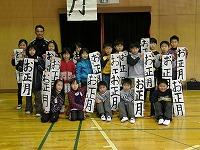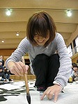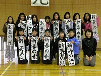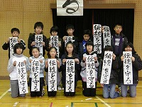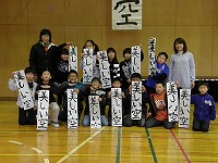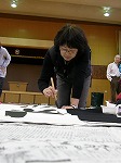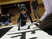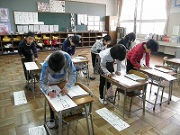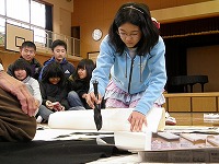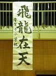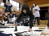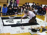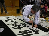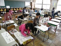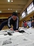 3年、4年、5年、6年と順に、一人1文字を書いて完成させます。全校の人が見ているので緊張します。