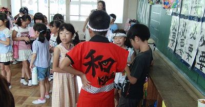 この日の招待客は3年生とAETのけいこさん。5年生の指示を聞きながら、みんなで「ごほうびワイワイ祭り」を盛り上げていました。