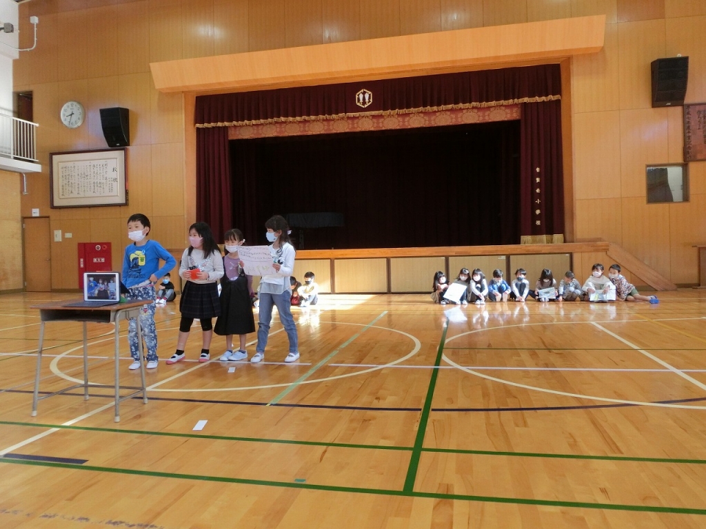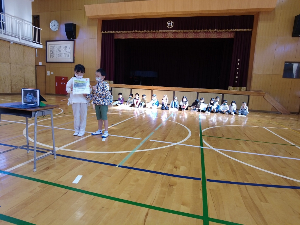 今日児童朝礼がありました。今日は1年生が全校の前で『生き物』について調べたことを発表してくれました。入学して半年…成長した姿を見ることができました。