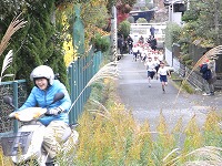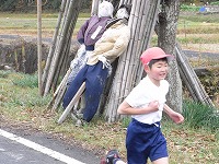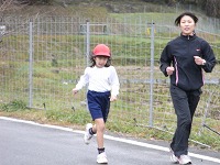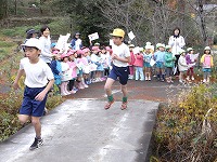 幼稚園児の声援に送られて高学年の出発です。行きは登り、帰りは下りの農道を走ります。