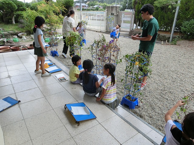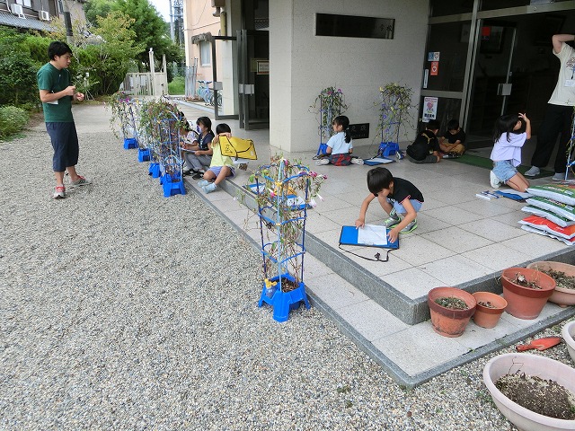 9月7日(木)1年生は、あさがおの観察をしました。夏休み中は家に持って帰ってお世話をがんばったので、綺麗に咲いている花もたくさんで、種もたくさんできていました。子どもたちは目と鼻と手などを使って、熱心に観察していました。