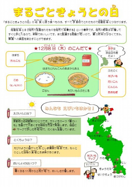 12月8日(木)今日の給食は「まるごときょうとのひ」献立でした。やっぱり地元京都の食材を使った給食はおいしかったです。子どもたちにもこのポスターでお知らせしました。