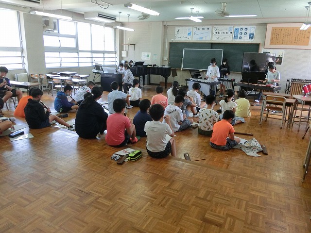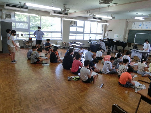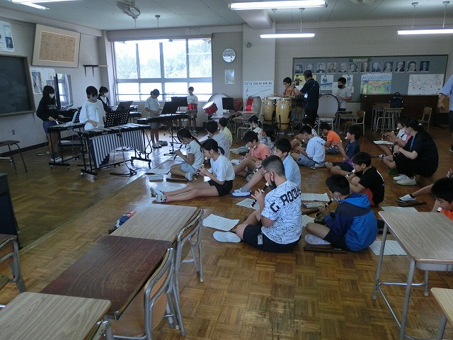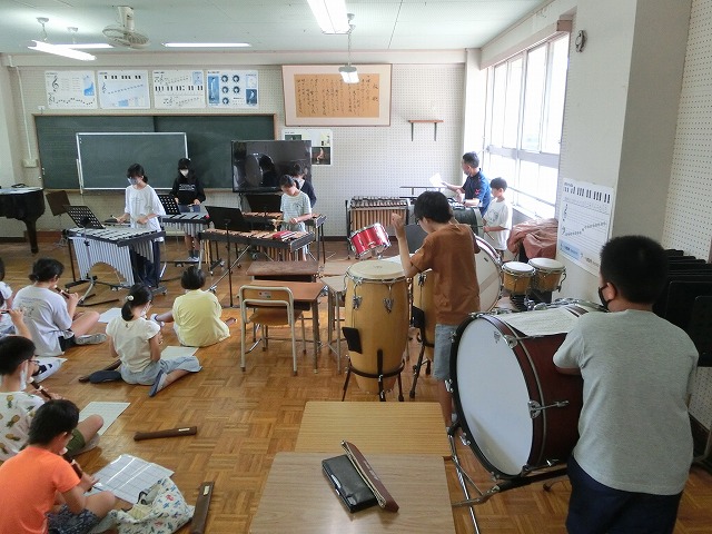 9月11日(月)今週も穏やかにスタートしました。今月末9月29日(金)に行われる学習発表会に向けて、5・6年生が合同で合奏練習をしました。今日は全員で一斉に、小節ごとに分けて、確認しながら何度も練習しました。