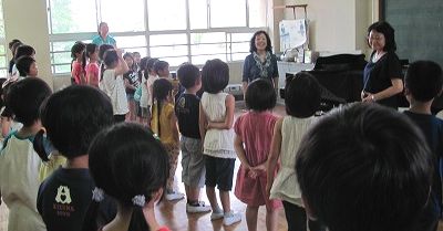 1回目の今回は、発声練習と『夏祭り』に歌う「やぁ!」と「星祭り」の2曲を練習しました。