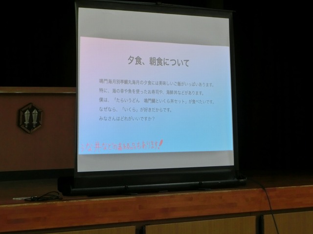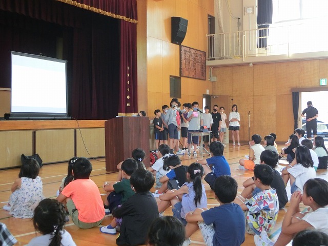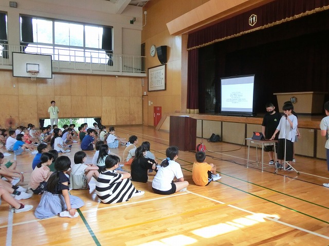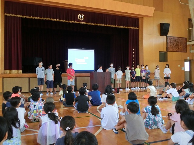 7月12日(水)今日の朝学習の時間に児童朝礼を行いました。今日は6年生が修学旅行の振り返りを発表しました。修学旅行で行ったそれぞれの場所について、各グループに分かれて事前に調べたこと、現地で感じたことや考えたことをタブレットを上手に使ってまとめました。1~5年生の子どもたちは修学旅行の写真に興味津々で、出されるクイズにも全力で答えていました。